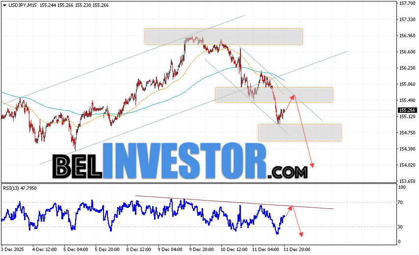 USD/JPY прогноз Японской Иены на 12 декабря 2025 предполагает попытку развития бычьей коррекции с тестом зоны сопротивления вблизи уровня 155.65. Затем, продолжение развития медвежьего импульса котировок в область ниже отметки 154.05. В пользу падения пары выступит тест линии тренда на индикаторе относительной силы. Отменой варианта снижения станет сильный рост котировок и пробой области 156.65. Это укажет на пробой уровня сопротивления и продолжение роста пары с потенциальной целью выше уровня 158.75.