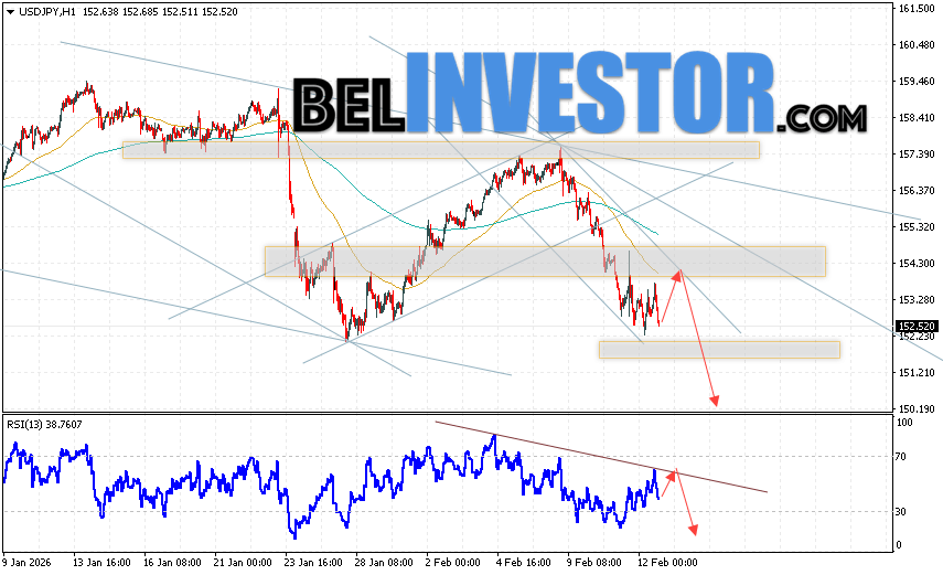 USD/JPY прогноз Японской Иены на 13 февраля 2026 предполагает попытку развития бычьей коррекции с тестом зоны сопротивления вблизи уровня 153.35. Затем, продолжение развития медвежьего импульса котировок в область ниже отметки 150.25. В пользу падения пары выступит тест линии тренда на индикаторе относительной силы. Отменой варианта падения станет сильный рост котировок и пробой области 154.75. Это укажет на пробой уровня сопротивления и продолжение подъёма пары с потенциальной целью выше уровня 156.65.