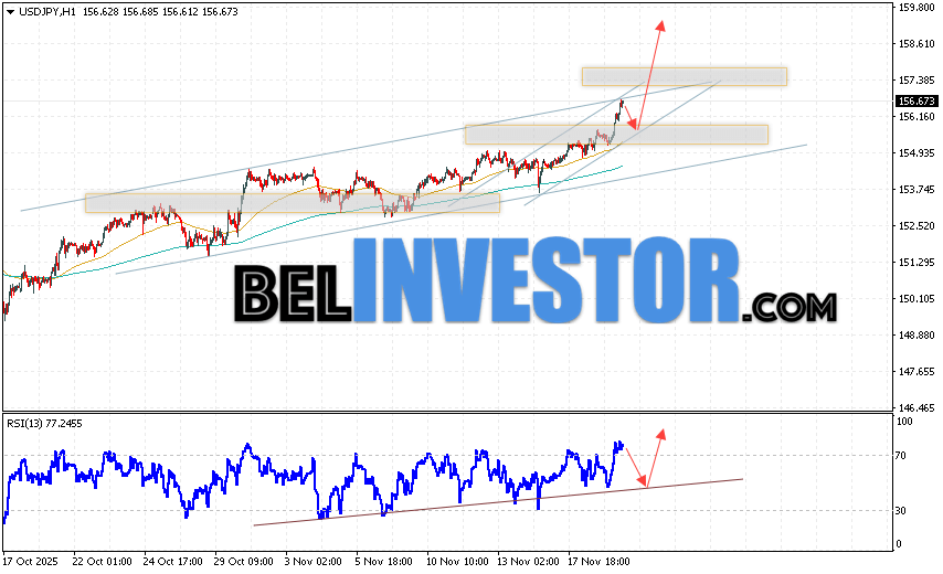 Котировки валютной пары Доллар Иена USD/JPY продолжают движение в рамках развития роста и бычьего канала. В момент публикации прогноза курс Доллара США к Японской Иене составляет 156.67. Скользящие средние указывают на наличие краткосрочной бычьей тенденции по паре. Цены пробили область сигнальными линиями вверх, что указывает на давление со стороны покупателей Доллара США и потенциальное продолжение роста цен уже с текущих уровней. В рамках прогноза курса Японской Иены на 20 ноября 2025 стоит ожидать попытку развития коррекции котировок и тест области поддержки вблизи уровня 155.85. Далее, отскок цены вверх и продолжение роста пары USD/JPY в область выше уровня 159.45.