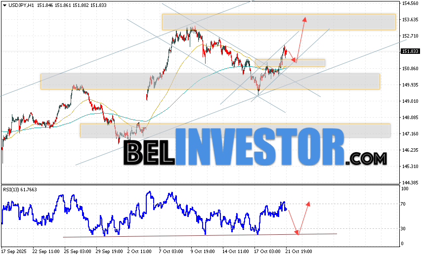 USD/JPY прогноз Японской Иены на 22 октября 2025 предполагает попытку развития медвежьей коррекции с тестом зоны поддержки вблизи уровня 150.85. Затем, продолжение развития бычьего импульса котировок в область выше отметки 153.65. В пользу роста пары выступит тест линии тренда на индикаторе относительной силы. Отменой варианта подъёма станет падение котировок и пробой области 149.75. Это укажет на пробой уровня поддержки и продолжение падения пары с потенциальной целью ниже уровня 147.05.