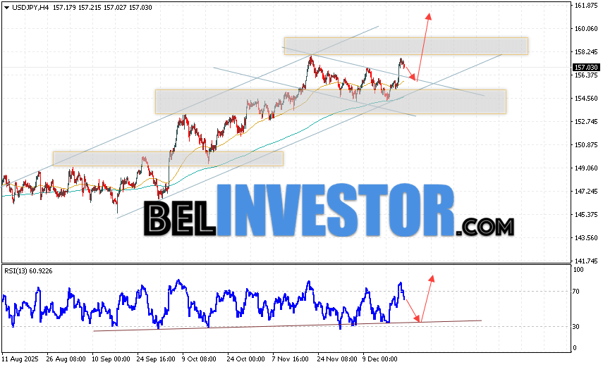 USD/JPY прогноз Японской Иены на 23 декабря 2025 предполагает попытку развития медвежьей коррекции с тестом зоны поддержки вблизи уровня 156.25. Затем, продолжение развития бычьего импульса котировок в область выше отметки 160.65. В пользу роста пары выступит тест линии тренда на индикаторе относительной силы. Отменой варианта подъёма станет падение котировок и пробой области 153.75. Это укажет на пробой уровня поддержки и продолжение падения пары с потенциальной целью ниже уровня 150.45.