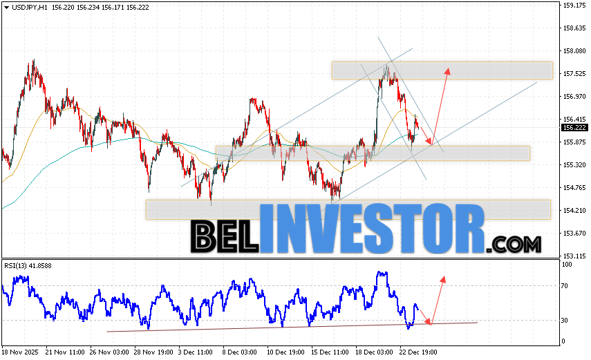 USD/JPY прогноз Японской Иены на 24 декабря 2025 предполагает попытку развития медвежьей коррекции с тестом зоны поддержки вблизи уровня 155.75. Затем, продолжение развития бычьего импульса котировок в область выше отметки 157.45. В пользу роста пары выступит тест линии тренда на индикаторе относительной силы. Отменой варианта подъёма станет падение котировок и пробой области 155.05. Это укажет на пробой уровня поддержки и продолжение падения пары с потенциальной целью ниже уровня 153.45.