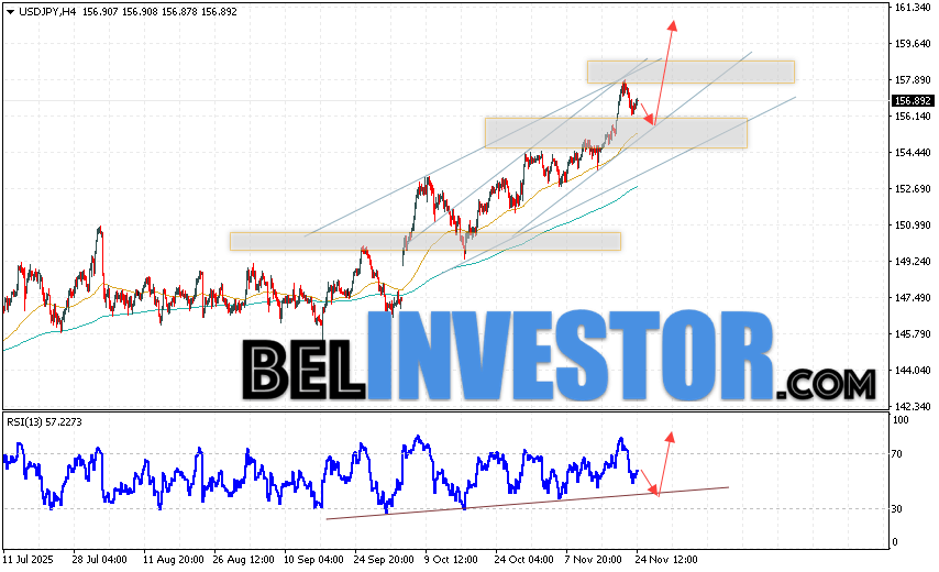 USD/JPY прогноз Японской Иены на 25 ноября 2025 предполагает попытку развития бычьей коррекции с тестом зоны поддержки вблизи уровня 155.75. Затем, продолжение развития бычьего импульса котировок в область выше отметки 160.65. В пользу роста пары выступит тест линии тренда на индикаторе относительной силы. Отменой варианта подъёма станет падение котировок и пробой области 154.05. Это укажет на пробой уровня поддержки и продолжение падения пары с потенциальной целью ниже уровня 152.25.