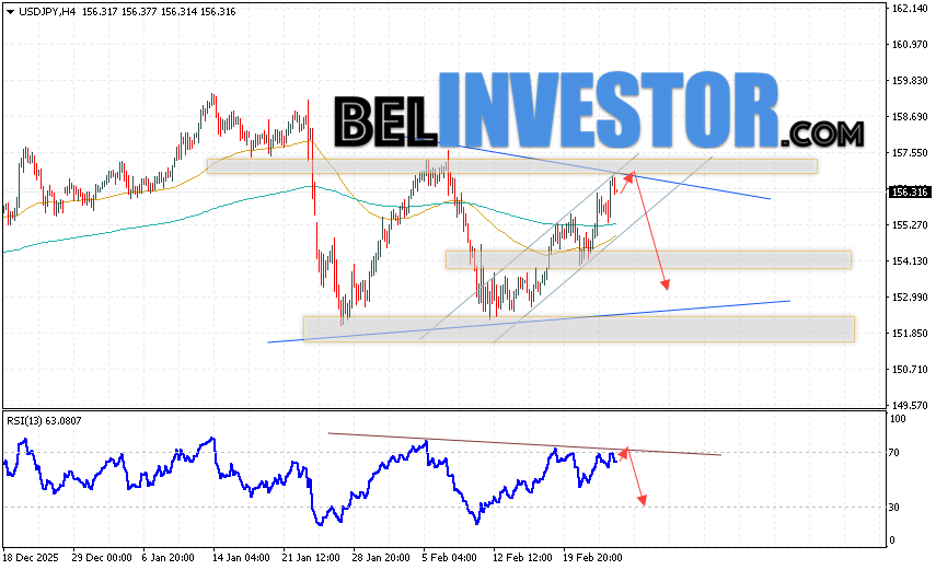 USD/JPY прогноз Японской Иены на 26 февраля 2026 предполагает попытку развития бычьей коррекции с тестом зоны сопротивления вблизи уровня 156.45. Затем, продолжение развития нисходящего импульса котировок в область ниже отметки 152.85. В пользу падения пары выступит тест линии тренда на индикаторе относительной силы. Отменой варианта снижения станет сильный рост котировок и пробой области 157.65. Это укажет на пробой уровня сопротивления и продолжение роста пары с потенциальной целью выше уровня 159.65.