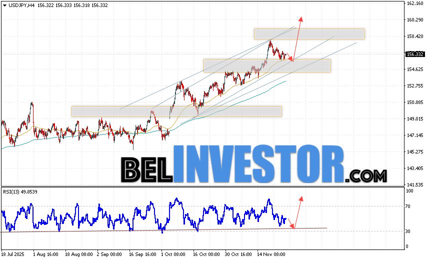 USD/JPY прогноз Японской Иены на 28 ноября 2025 предполагает попытку развития медвежьей коррекции с тестом зоны поддержки вблизи уровня 156.05. Затем, продолжение развития бычьего импульса котировок в область выше отметки 160.45. В пользу роста пары выступит тест линии тренда на индикаторе относительной силы. Отменой варианта подъёма станет падение котировок и пробой области 154.45. Это укажет на пробой уровня поддержки и продолжение падения пары с потенциальной целью ниже уровня 152.65.
