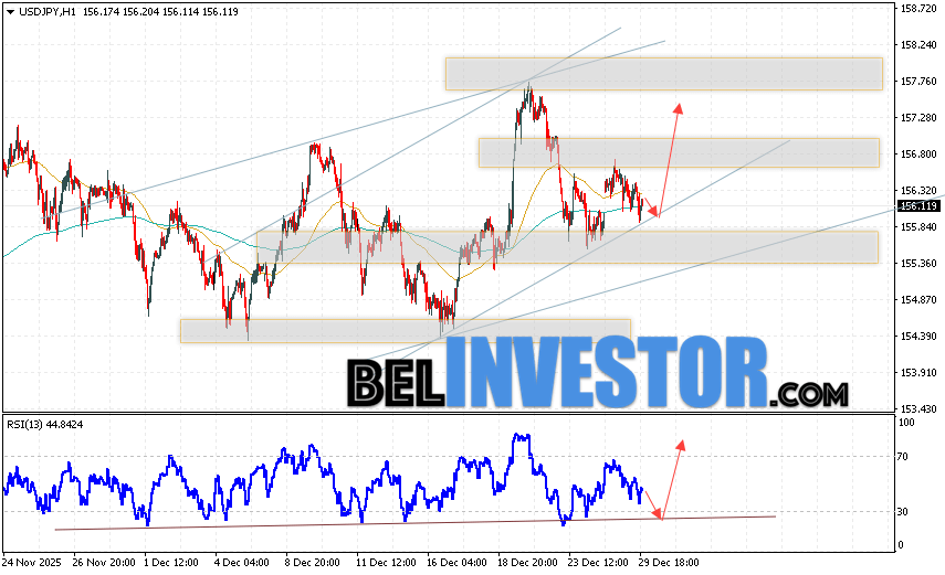 USD/JPY прогноз Японской Иены на 30 декабря 2025 предполагает попытку развития медвежьей коррекции с тестом зоны поддержки вблизи уровня 155.85. Затем, продолжение развития бычьего импульса котировок в область выше отметки 157.45. В пользу роста пары выступит тест линии тренда на индикаторе относительной силы. Отменой варианта подъёма станет падение котировок и пробой области 155.25. Это укажет на пробой уровня поддержки и продолжение падения пары с потенциальной целью ниже уровня 152.85.