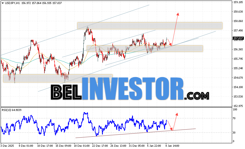 Котировки валютной пары Доллар Иена USD/JPY продолжают движение в рамках развития роста и бычьего канала. В момент публикации прогноза курс Доллара США к Японской Иене составляет 157.03. Скользящие средние указывают на наличие краткосрочной бычьей тенденции по паре. Цены пробили область между сигнальными линиями вверх, что указывает на давление со стороны покупателей Доллара США и потенциальное продолжение роста цен уже с текущих уровней. В рамках прогноза курса Японской Иены на 9 января 2026 стоит ожидать попытку развития снижения котировок и тест области поддержки вблизи уровня 156.45. Далее, отскок цены вверх и продолжение роста пары USD/JPY в область выше уровня 158.65.