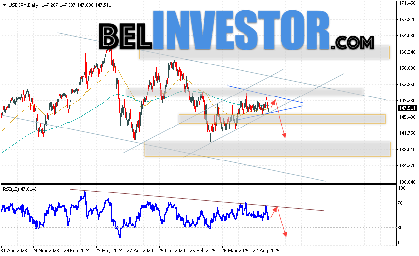 Дополнительным сигналом в пользу падения пары Доллар Иена на текущий торговой неделе выступит тест медвежьей линии тренда на индикаторе относительной силы. Вторым сигналом станет отскок от верхней границы модели «Треугольник». Отменой варианта падения пары USD/JPY на текущей торговой неделе 6 — 10 октября 2025 выступит сильный рост и пробой области 151.75. Такой вариант укажет на пробой области сопротивления и продолжение роста пары на Форекс в область выше уровня 153.65. Подтверждением падению по паре USD/JPY выступит пробой области поддержки и закрытие цены под уровнем 145.05, что укажет на пробой нижней границы модели «Треугольник» и начало реализации паттерна с целями внизу.