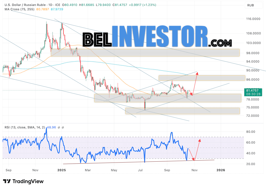 USD/RUB прогноз Доллара на 20 — 24 октября 2025 предполагает попытку развития медвежьей коррекции и теста области поддержки вблизи уровня 80.05. Откуда стоит ожидать отскок вверх и продолжения роста курса Доллара США в область выше уровня 87.65. Дополнительным сигналом в пользу такого варианта станет отскок от линии тренда на индикаторе относительной силы. Отменой варианта роста курса Доллара на текущей торговой неделе станет падение и пробой области 78.25. Что укажет на продолжение падения пары с целью на уровне 75.45.