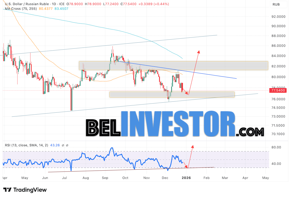 USD/RUB прогноз Доллара на 29 декабря 2025 — 2 января 2026 предполагает попытку развития медвежьей коррекции и теста области поддержки вблизи уровня 76.25. Откуда стоит ожидать отскок вверх и продолжения роста курса Доллара США в область выше уровня 84.45. Дополнительным сигналом в пользу такого варианта станет отскок от линии тренда на индикаторе относительной силы. Отменой варианта роста курса Доллара на текущей торговой неделе станет падение и пробой области 73.55. Что укажет на продолжение падения пары с целью на уровне 69.55.