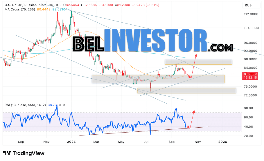 USD/RUB прогноз Доллара на 6 — 10 октября 2025 предполагает попытку развития медвежьей коррекции и теста области поддержки вблизи уровня 80.25. Откуда стоит ожидать отскок вверх и продолжения роста курса Доллара США в область выше уровня 88.65. Дополнительным сигналом в пользу такого варианта станет отскок от линии тренда на индикаторе относительной силы. Отменой варианта роста курса Доллара на текущей торговой неделе станет падение и пробой области 78.75. Что укажет на продолжение падения пары с целью на уровне 74.85.