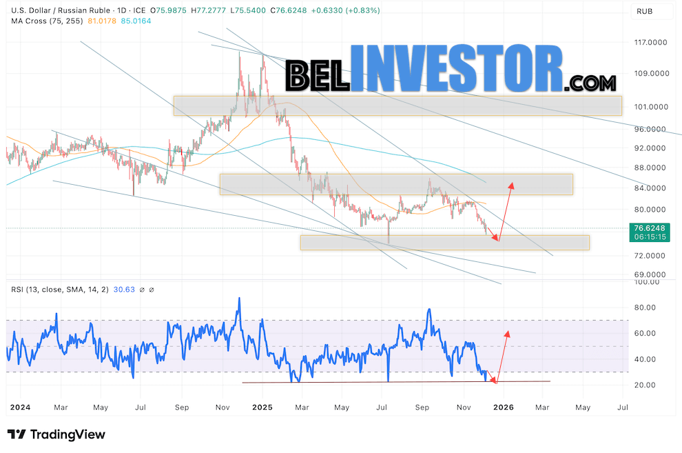 USD/RUB прогноз Доллара на 8 — 12 декабря 2025 предполагает попытку развития медвежьей коррекции и теста области поддержки вблизи уровня 76.05. Откуда стоит ожидать отскок вверх и продолжения роста курса Доллара США в область выше уровня 84.05. Дополнительным сигналом в пользу такого варианта станет отскок от линии тренда на индикаторе относительной силы. Отменой варианта роста курса Доллара на текущей торговой неделе станет падение и пробой области 71.75. Что укажет на продолжение падения пары с целью на уровне 69.25.
