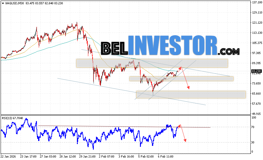 Дополнительным сигналом в пользу снижения котировок и цен на Серебро XAG/USD выступит тест линии сопротивления на индикаторе относительной силы (RSI). Вторым сигналом в пользу снижения станет отскок от верхней границы медвежьего канала. Отменой варианта падения цен на Серебро 10 февраля 2026 станет сильный рост и пробой 90.05. Это укажет на пробой области сопротивления и продолжение роста в область выше уровня 105.05. Ожидать ускорения падению котировок XAG/USD стоит с пробоем области поддержки и закреплением цены под уровнем 75.65, что укажет на пробой нижней границы бычьего канала коррекции.