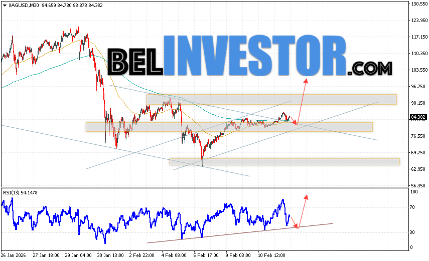 Серебро прогноз XAG/USD на 12 февраля 2026 предполагает попытку теста области поддержки вблизи уровня 82.45. Далее, стоит ожидать отскок цены вверх и продолжения роста цены на Серебро с целью выше уровня 97.65. Отменой варианта подъёма цен на Серебра выступит падение котировок актива и пробой уровня 76.35. Это укажет на пробой области поддержки. В этом случае стоит ожидать продолжения снижения цены Серебра с целью на уровне 65.05.