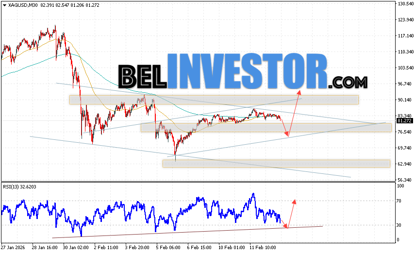 Дополнительным сигналом в пользу роста котировок и цен на Серебро XAG/USD выступит тест линии поддержки на индикаторе относительной силы (RSI). Вторым сигналом в пользу снижения станет отскок от нижней границы бычьего канала.. Отменой варианта роста цен на Серебро 13 февраля 2026 станет падение и пробой 69.55. Это укажет на пробой области поддержки и продолжение падения в область ниже уровня 62.65. Ожидать ускорения росту котировок XAG/USD стоит с пробоем области сопротивления и закреплением цены над уровнем 86.05, что укажет на пробой верхней границы нисходящего канала.