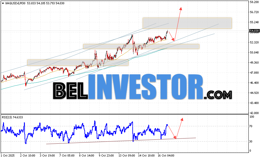 Дополнительным сигналом в пользу роста котировок и цен на Серебро XAG/USD выступит тест линии поддержки на индикаторе относительной силы (RSI). Вторым сигналом в пользу подъёма станет отскок от нижней границы бычьего канала. Отменой варианта роста цен на Серебро 17 октября 2025 станет падение и пробой 50.65. Это укажет на пробой области поддержки и продолжение падения в область ниже уровня 48.25. Ожидать ускорения росту котировок XAG/USD стоит с пробоем области сопротивления и закреплением цены над уровнем 54.65.