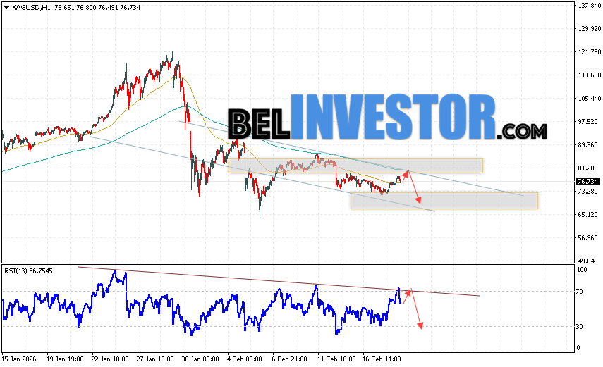 Дополнительным сигналом в пользу падения котировок и цен на Серебро XAG/USD выступит тест линии сопротивления на индикаторе относительной силы (RSI). Вторым сигналом в пользу снижения станет отскок от верхней границы нисходящего канала. Отменой варианта падения цен на Серебро 19 февраля 2026 станет сильный рост и пробой 83.55. Это укажет на пробой области сопротивления и продолжение роста в область выше уровня 90.05. Ожидать ускорения падению котировок XAG/USD стоит с пробоем области поддержки и закреплением цены под уровнем 73.05.