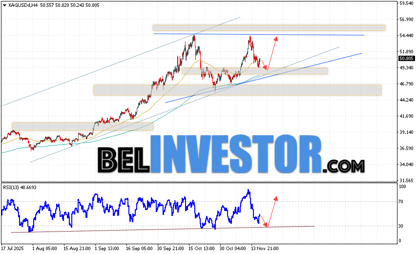 Дополнительным сигналом в пользу роста котировок и цен на Серебро XAG/USD выступит тест линии поддержки на индикаторе относительной силы (RSI). Вторым сигналом в пользу снижения станет отскок от нижней границы бычьего канала. Отменой варианта подъёма цен на Серебро 19 ноября 2025 станет падение и пробой 49.25. Это укажет на пробой области сопротивления и продолжение роста в область выше уровня 47.55. Ожидать ускорения росту котировок XAG/USD стоит с пробоем области сопротивления и закреплением цены над уровнем 55.05, что укажет на пробой верхней границы модели «Треугольник» и начало реализации паттерна с целями вверху.