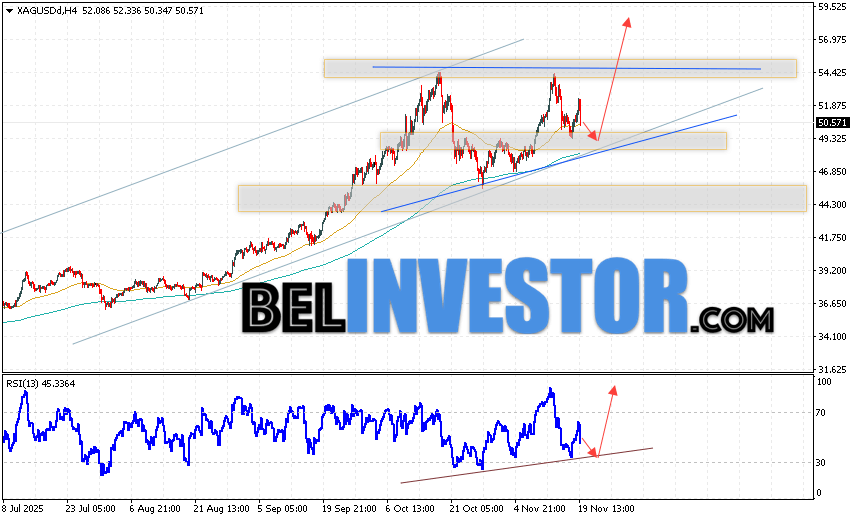 Дополнительным сигналом в пользу роста котировок и цен на Серебро XAG/USD выступит тест линии поддержки на индикаторе относительной силы (RSI). Вторым сигналом в пользу снижения станет отскок от нижней границы бычьего канала. Отменой варианта подъёма цен на Серебро 20 ноября 2025 станет падение и пробой 48.05. Это укажет на пробой области сопротивления и продолжение роста в область выше уровня 47.25. Ожидать ускорения росту котировок XAG/USD стоит с пробоем области сопротивления и закреплением цены над уровнем 55.05, что укажет на пробой верхней границы модели «Треугольник» и начало реализации паттерна с целями вверху.