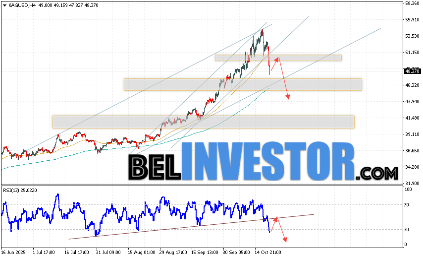 Дополнительным сигналом в пользу снижения котировок и цен на Серебро XAG/USD выступит тест линии сопротивления на индикаторе относительной силы (RSI). Вторым сигналом в пользу снижения станет отскок от верхней границы медвежьего канала. Отменой варианта падения цен на Серебро 22 октября 2025 станет сильный рост и пробой 53.65. Это укажет на пробой области сопротивления и продолжение роста в область выше уровня 56.05. Ожидать ускорения падению котировок XAG/USD стоит с пробоем области поддержки и закреплением цены под уровнем 46.05, что укажет на пробой нижней границы бычьего канала.