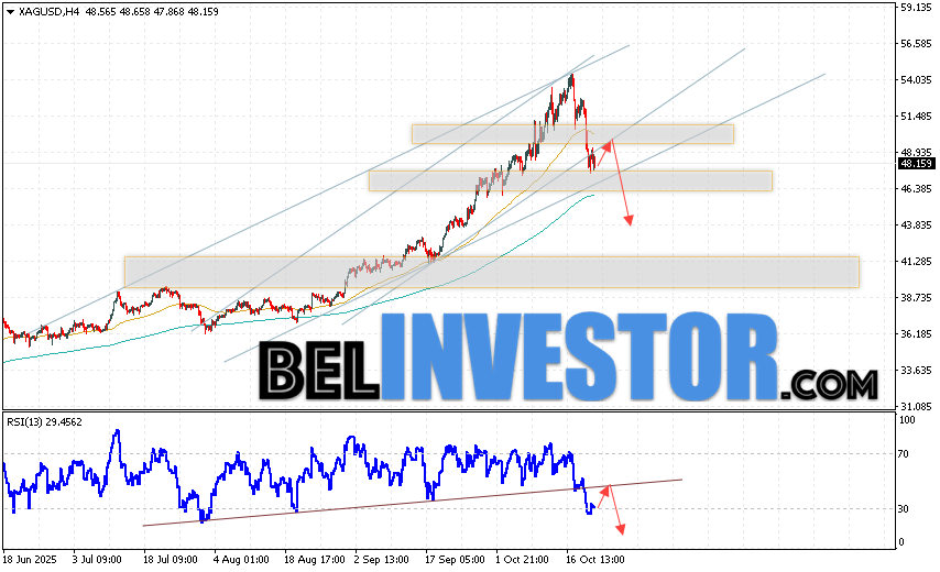Дополнительным сигналом в пользу снижения котировок и цен на Серебро XAG/USD выступит тест линии сопротивления на индикаторе относительной силы (RSI). Вторым сигналом в пользу снижения станет отскок от нижней границы бычьего канала. Отменой варианта падения цен на Серебро 23 октября 2025 станет сильный рост и пробой 54.35. Это укажет на пробой области сопротивления и продолжение роста в область выше уровня 56.35. Ожидать ускорения падению котировок XAG/USD стоит с пробоем области поддержки и закреплением цены под уровнем 46.05, что укажет на пробой нижней границы бычьего канала.