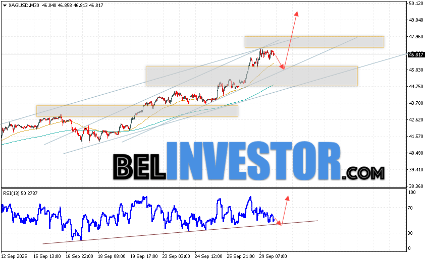 Дополнительным сигналом в пользу роста котировок и цен на Серебро XAG/USD выступит тест линии поддержки на индикаторе относительной силы (RSI). Вторым сигналом в пользу подъёма станет отскок от нижней границы бычьего канала. Отменой варианта роста цен на Серебро 30 сентября 2025 станет падение и пробой 44.05. Это укажет на пробой области поддержки и продолжение падения в область ниже уровня 42.35. Ожидать ускорения росту котировок XAG/USD стоит с пробоем области сопротивления и закреплением цены над уровнем 47.05, что укажет на пробой верхней границы бычьего канала, а это сигнал к росту на ширину канала.