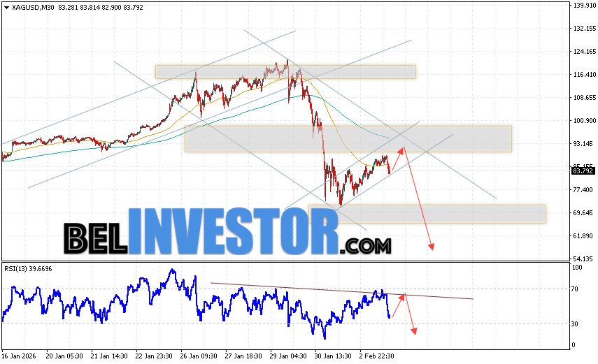 Дополнительным сигналом в пользу снижения котировок и цен на Серебро XAG/USD выступит тест линии сопротивления на индикаторе относительной силы (RSI). Вторым сигналом в пользу снижения станет отскок от верхней границы медвежьего канала. Отменой варианта падения цен на Серебро 4 февраля 2026 станет сильный рост и пробой 103.55. Это укажет на пробой области сопротивления и продолжение роста в область выше уровня 115.65. Ожидать ускорения падению котировок XAG/USD стоит с пробоем области поддержки и закреплением цены под уровнем 76.55, что укажет на пробой нижней границы бычьего канала коррекции.