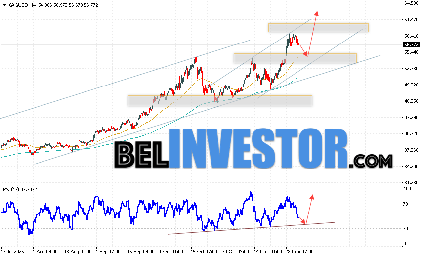 Серебро прогноз XAG/USD на 5 декабря 2025 предполагает попытку теста области поддержки вблизи уровня 55.35. Далее, продолжение роста котировок с целью выше уровня 61.85. Отменой варианта подъёма цен на Серебра выступит падение и пробой уровня 52.15. Это укажет на пробой области поддержки. В этом случае стоит ожидать продолжения падения цены Серебра с целью на уровне 51.35.