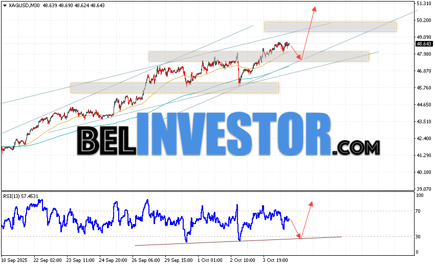 Дополнительным сигналом в пользу роста котировок и цен на Серебро XAG/USD выступит тест линии поддержки на индикаторе относительной силы (RSI). Вторым сигналом в пользу подъёма станет отскок от нижней границы бычьего канала. Отменой варианта роста цен на Серебро 7 октября 2025 станет падение и пробой 46.35. Это укажет на пробой области поддержки и продолжение падения в область ниже уровня 45.05. Ожидать ускорения росту котировок XAG/USD стоит с пробоем области сопротивления и закреплением цены над уровнем 49.15.