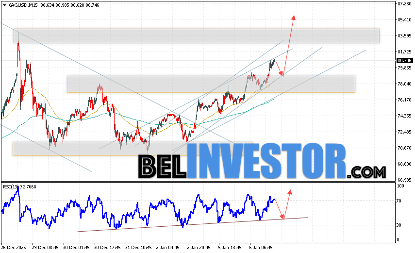 Дополнительным сигналом в пользу роста котировок и цен на Серебро XAG/USD выступит тест линии поддержки на индикаторе относительной силы (RSI). Вторым сигналом в пользу снижения станет отскок от нижней границы бычьего канала. Отменой варианта подъёма цен на Серебро 7 января 2026 станет падение и пробой 76.55. Это укажет на пробой области поддержки и продолжение падения в область ниже уровня 70.65. Ожидать ускорения росту котировок XAG/USD стоит с пробоем области сопротивления и закреплением цены над уровнем 82.05.