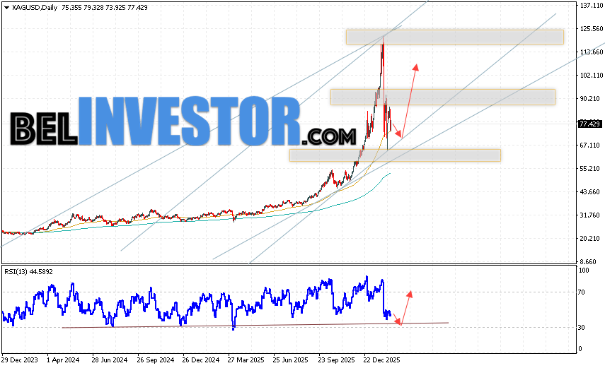 В пользу роста котировок и цен на Серебро на текущей торговой неделе 16 — 20 февраля 2026 выступит отскок от линии поддержки на индикаторе относительной силы. Вторым сигналом станет отскок от нижней границы бычьего канала. Отменой варианта роста котировок XAG/USD выступит падение и пробой области 60.05. Это укажет на пробой области поддержки и продолжение падения цен на Серебро с целью ниже уровня 45.05. Подтверждением развития росту выступит пробой уровня сопротивления и закрытие цен выше уровня 90.65, что укажет на пробой верхней границы разворотной модели «Голова и плечи» на мелких временных промежутках.