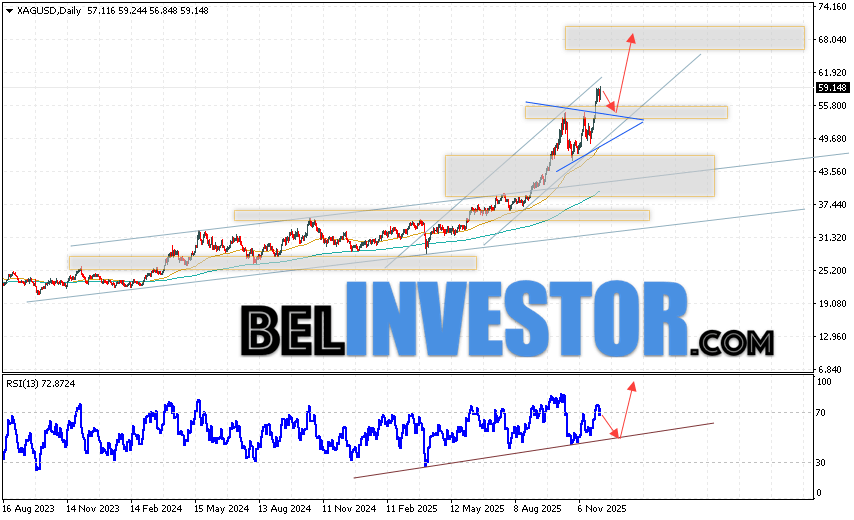 Серебро прогноз XAG/USD на неделю 8 — 12 декабря 2025 предполагает попытку теста уровня поддержки вблизи области 55.25. Затем, продолжение роста цен на Серебро с целью выше уровня 68.05. В пользу подъёма выступит тест линии тренда на индикаторе относительной силы. Отменой варианта роста XAG/USD станет падение и пробой уровня 48.25. Это укажет на продолжение снижения котировок в область ниже уровня 43.65.