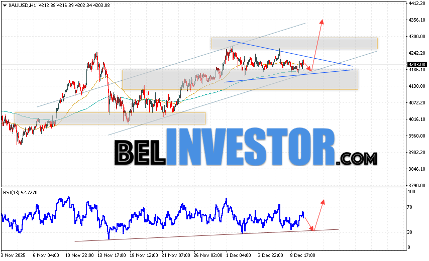 Дополнительным сигналом в пользу подъёма котировок XAU/USD выступит тест бычьей линии поддержки на индикаторе относительной силы (индикатор RSI). Вторым сигналом станет отбой от нижней границы бычьего канала. Отменой варианта роста цен на Золото 10 декабря 2025 станет падение котировок и пробой уровня 4125. Это укажет на пробой области поддержки и продолжение падения котировок актива в область ниже уровня 3935. Ожидать ускорения росту котировок XAU/USD стоит с пробоем области сопротивления и закрытием цены над уровнем 4265, что укажет на пробой верхней границы модели «Треугольник» и начало реализации паттерна с целями вверху.