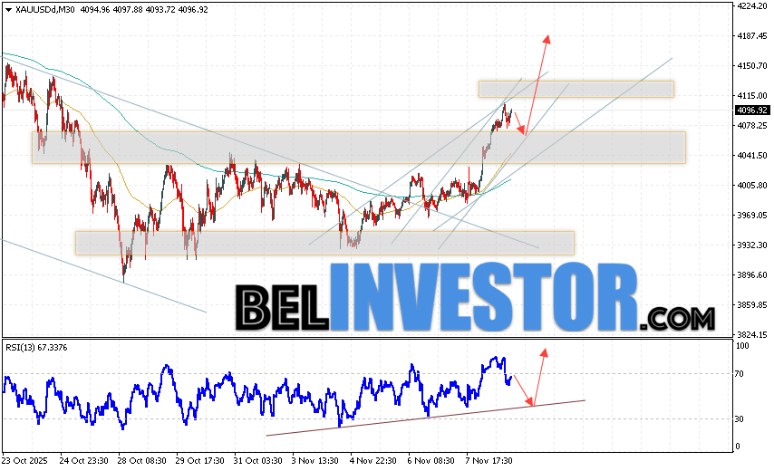 Золото прогноз XAU/USD на 11 ноября 2025 предполагает попытку развития медвежьей коррекции цены и теста области поддержки вблизи уровня 4075. Далее, продолжение роста котировок цветного металла с целью выше уровня 4185. Отменой варианта роста цен на Золото выступит падение стоимости актива на рынках и пробой уровня 4015. Это укажет на продолжение падения цены Золота с потенциальной целью ниже отметки 3865.