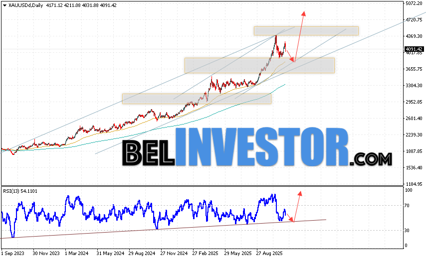 Дополнительным сигналом в пользу роста котировок и цен на Золото на текущей торговой неделе 17 — 21 ноября 2025 выступит отбой от бычьей линии тренда на индикаторе относительной силы (RSI). Вторым сигналом станет отскок от нижней границы восходящего канала. Отменой варианта подъёма котировок XAU/USD станет падение цены и пробой области 3475. Это укажет на пробой уровня нижней границы бычьего канала и продолжение падения цен на Золото с целью ниже уровня 2965. Подтверждением росту стоимости актива выступит пробой области сопротивления и закрытие котировок выше уровня 4125.