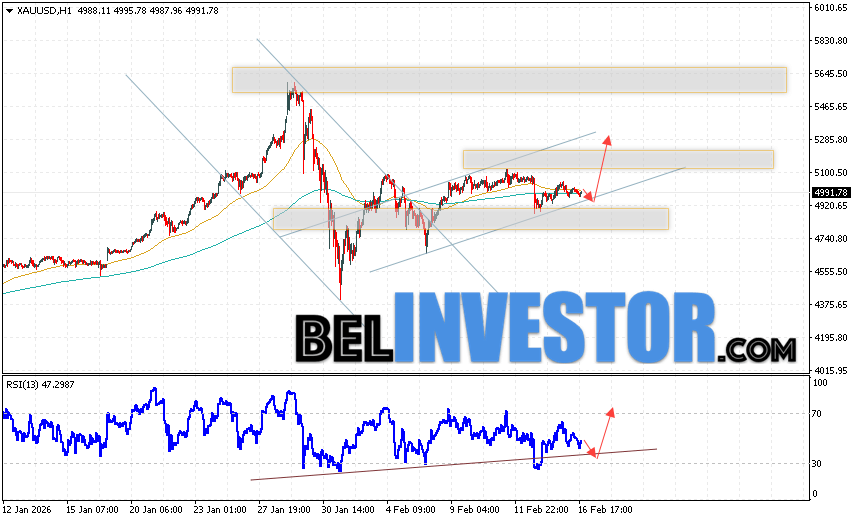 Дополнительным сигналом в пользу роста котировок XAU/USD выступит тест линии тренда на индикаторе относительной силы (индикатор RSI). Вторым сигналом станет отбой от нижней границы бычьего канала. Отменой варианта роста цен на Золото 17 февраля 2026 станет падение котировок и пробой уровня 4805. Это укажет на пробой области поддержки и продолжение падения котировок актива в область ниже уровня 4535. Ожидать ускорения росту котировок XAU/USD стоит с пробоем области сопротивления и закрытием цены над уровнем 5075.