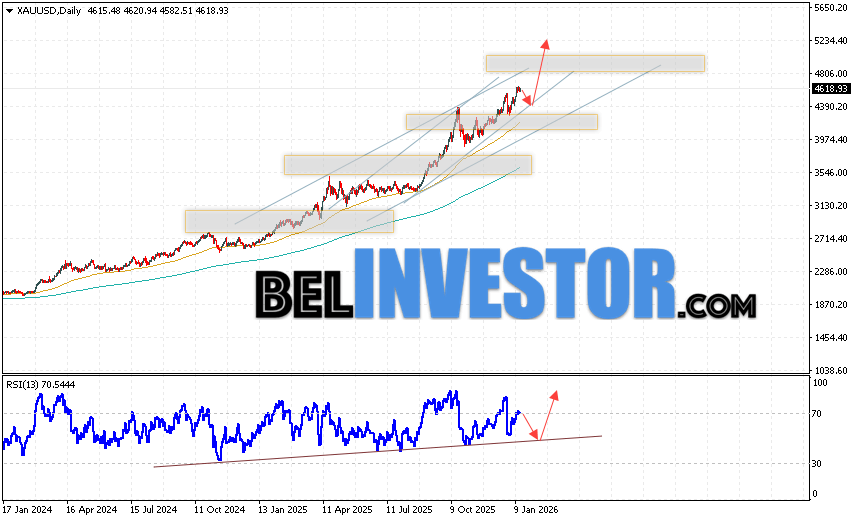Золото прогноз XAU/USD на 19 — 23 января 2026 предполагает попытку развития медвежьей коррекции и теста уровня поддержки вблизи области 4385. Затем, продолжение роста цен на Золото с целью выше уровня 5235. В пользу подъёма котировок выступит тест линии тренда на индикаторе относительной силы. Отменой варианта роста Золота станет падение и пробой уровня 4445. Это укажет на продолжение снижения котировок в область ниже уровня 3785.
