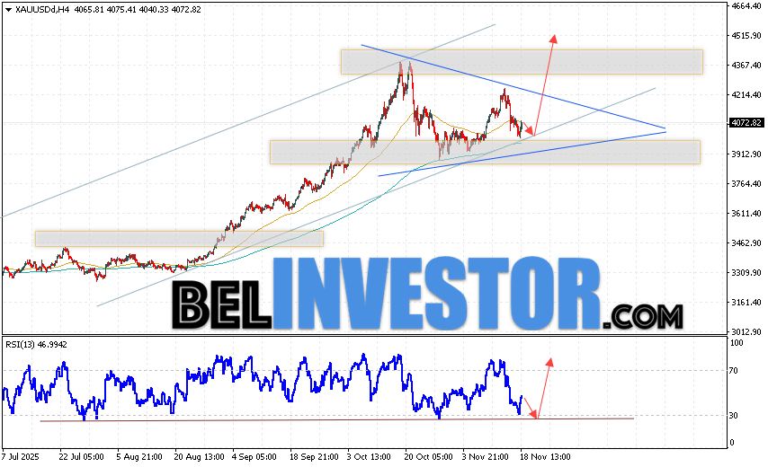 Дополнительным сигналом в пользу подъёма котировок XAU/USD выступит тест бычьей линии поддержки на индикаторе относительной силы (индикатор RSI). Вторым сигналом станет отбой от нижней границы бычьего канала. Отменой варианта роста цен на Золото 19 ноября 2025 станет падение котировок и пробой уровня 3865. Это укажет на пробой области поддержки и продолжение падения котировок актива в область ниже уровня 3745. Ожидать ускорения росту котировок XAU/USD стоит с пробоем области сопротивления и закрытием цены над уровнем 4275, что укажет на пробой верхней границы модели «Треугольник» и начало реализации паттерна с целями вверху.
