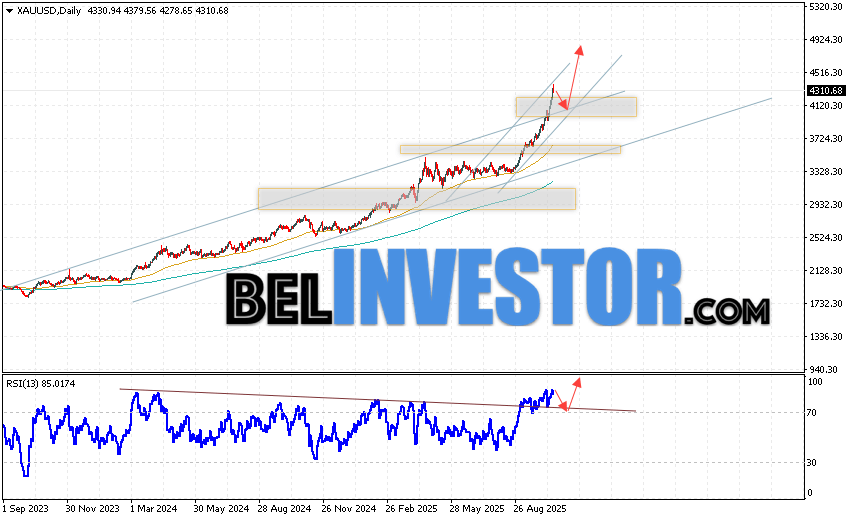 Золото прогноз XAU/USD на 20 — 24 октября 2025 предполагает попытку развития медвежьей коррекции и теста уровня поддержки вблизи области 4095. Затем, продолжение роста цен на Золото с целью выше уровня 4655. В пользу подъёма котировок выступит тест линии тренда на индикаторе относительной силы. Отменой варианта роста Золота станет падение и пробой уровня 3865. Это укажет на продолжение снижения котировок в область ниже уровня 3265.