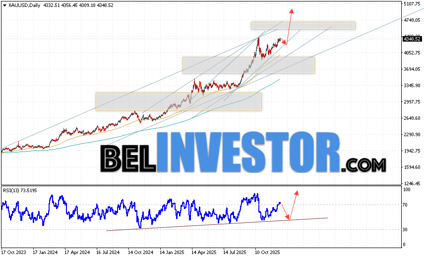 Дополнительным сигналом в пользу роста котировок и цен на Золото на текущей торговой неделе 22 — 26 декабря 2025 выступит отбой от бычьей линии тренда на индикаторе относительной силы (RSI). Вторым сигналом станет отскок от нижней границы восходящего канала. Отменой варианта подъёма котировок XAU/USD станет падение цены и пробой области 4045. Это укажет на пробой уровня нижней границы бычьего канала и продолжение падения цен на Золото с целью ниже уровня 3665. Подтверждением росту стоимости актива выступит пробой области сопротивления и закрытие котировок выше уровня 4465.