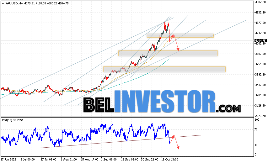 Дополнительным сигналом в пользу падения котировок XAU/USD выступит тест пробитой линии поддержки на индикаторе относительной силы (индикатор RSI). Вторым сигналом станет отбой от нижней границы бычьего канала. Отменой варианта падения цен на Золото 22 октября 2025 станет сильный рост котировок и пробой уровня 4245. Это укажет на пробой области сопротивления и продолжение роста котировок актива в область выше уровня 4385. Ожидать ускорения падению котировок XAU/USD стоит с пробоем области поддержки и закрытием цены под уровнем 4045.