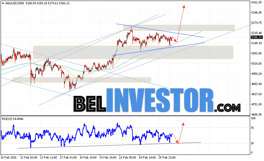 Золото прогноз XAU/USD на 27 февраля 2026 предполагает попытку развития медвежьей коррекции цены и теста области поддержки вблизи уровня 5145. Далее, продолжение роста котировок цветного металла с целью выше уровня 5375. Отменой варианта роста цен на Золото выступит падение стоимости актива на рынках и пробой уровня 5065. Это укажет на продолжение снижения цены Золота с потенциальной целью ниже отметки 4835.