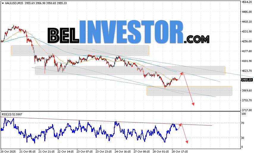 Золото прогноз XAU/USD на 29 октября 2025 предполагает попытку развития бычьей коррекции цены и теста области сопротивления вблизи уровня 4015. Далее, продолжение падения котировок цветного металла с целью ниже уровня 3765. Отменой варианта снижения цен на Золото выступит сильный рост стоимости актива на рынках и пробой уровня 4105. Это укажет на продолжение подъёма цены Золота с потенциальной целью выше отметки 4365.