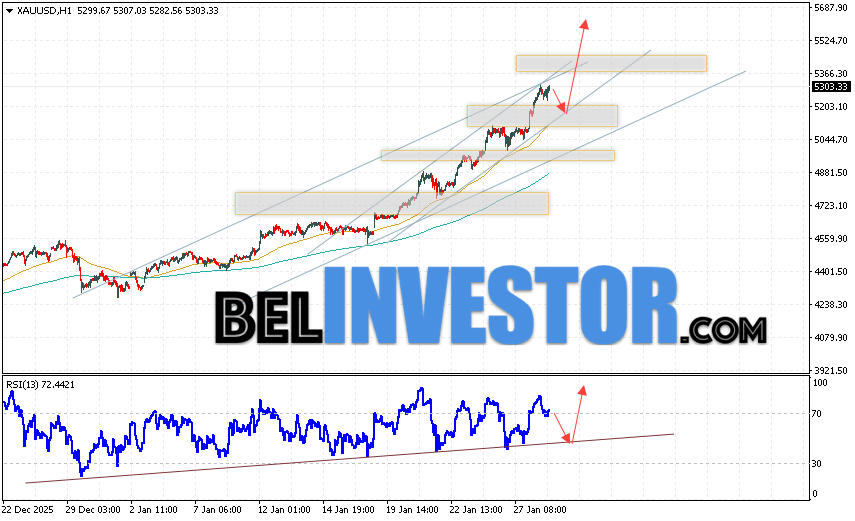 Дополнительным сигналом в пользу подъёма котировок XAU/USD выступит тест бычьей линии поддержки на индикаторе относительной силы (индикатор RSI). Вторым сигналом станет отбой от нижней границы восходящего канала. Отменой варианта роста цен на Золото 29 января 2026 станет падение котировок и пробой уровня 5165. Это укажет на пробой области поддержки и продолжение падения котировок актива в область ниже уровня 4965. Ожидать ускорения росту котировок XAU/USD стоит с пробоем области сопротивления и закрытием цены над уровнем 5365.