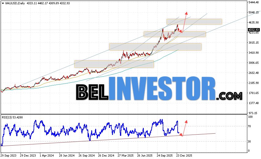 Дополнительным сигналом в пользу роста котировок и цен на Золото на текущей торговой неделе 5 — 9 января 2026 выступит отбой от бычьей линии тренда на индикаторе относительной силы (RSI). Вторым сигналом станет отскок от нижней границы восходящего канала. Отменой варианта подъёма котировок XAU/USD станет падение цены и пробой области 4215. Это укажет на пробой уровня нижней границы бычьего канала и продолжение падения цен на Золото с целью ниже уровня 3865. Подтверждением росту стоимости актива выступит пробой области сопротивления и закрытие котировок выше уровня 4655.