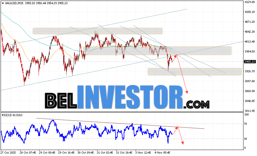 Дополнительным сигналом в пользу падения котировок XAU/USD выступит тест пробитой линии поддержки на индикаторе относительной силы (индикатор RSI). Вторым сигналом станет отбой от нижней границы бычьего канала. Отменой варианта падения цен на Золото 5 ноября 2025 станет сильный рост котировок и пробой уровня 4015. Это укажет на пробой области сопротивления и продолжение роста котировок актива в область выше уровня 4085. Ожидать ускорения падению котировок XAU/USD стоит с пробоем области поддержки и закрытием цены под уровнем 3925.