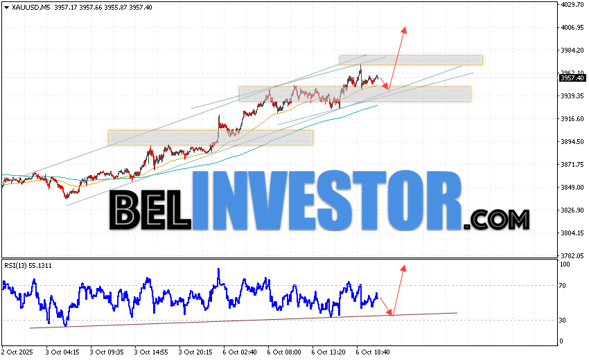 Дополнительным сигналом в пользу роста котировок XAU/USD выступит тест бычьей линии поддержки на индикаторе относительной силы (индикатор RSI). Вторым сигналом станет отбой от нижней границы бычьего канала. Отменой варианта роста цен на Золото 7 октября 2025 станет падение котировок и пробой уровня 3895. Это укажет на пробой области поддержки и продолжение падения котировок актива в область ниже уровня 3785. Ожидать ускорения росту котировок XAU/USD стоит с пробоем области сопротивления и закрытием цены над уровнем 3975.